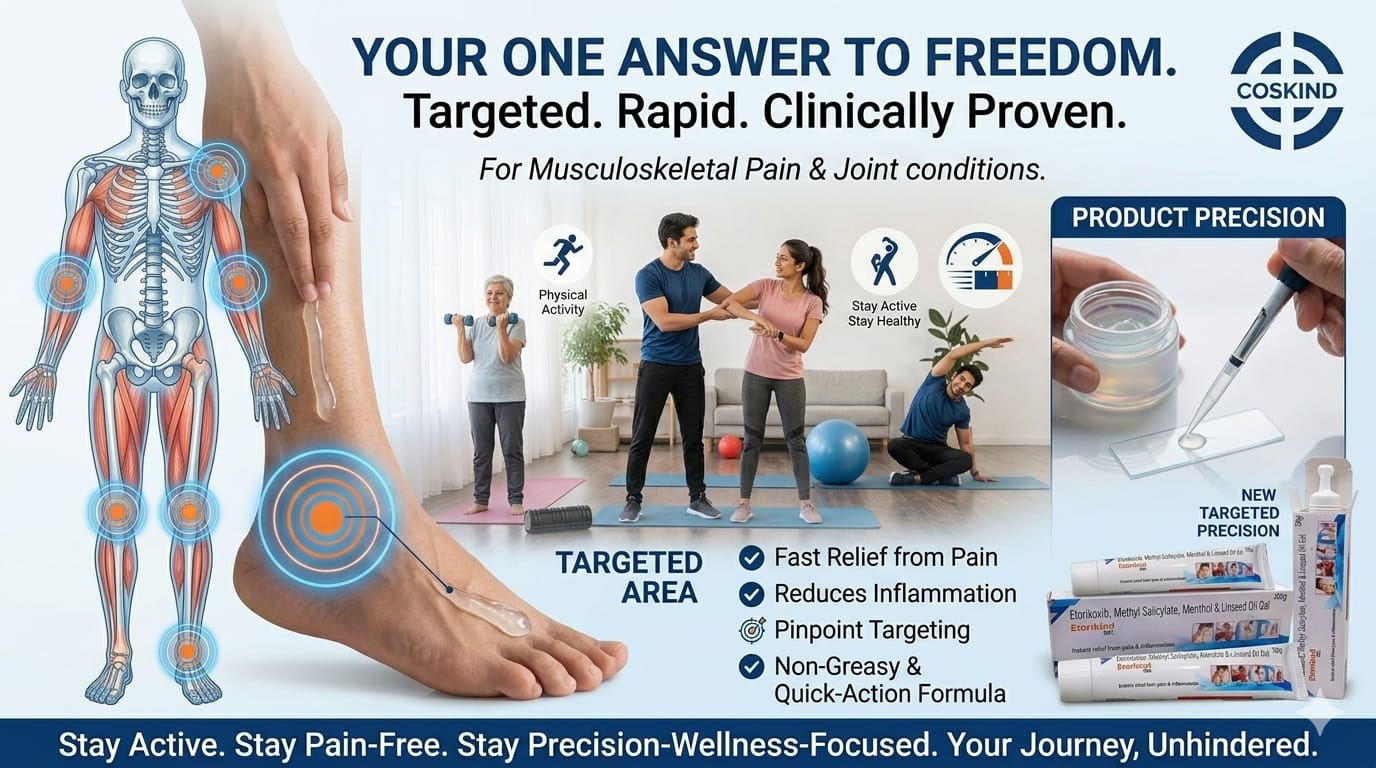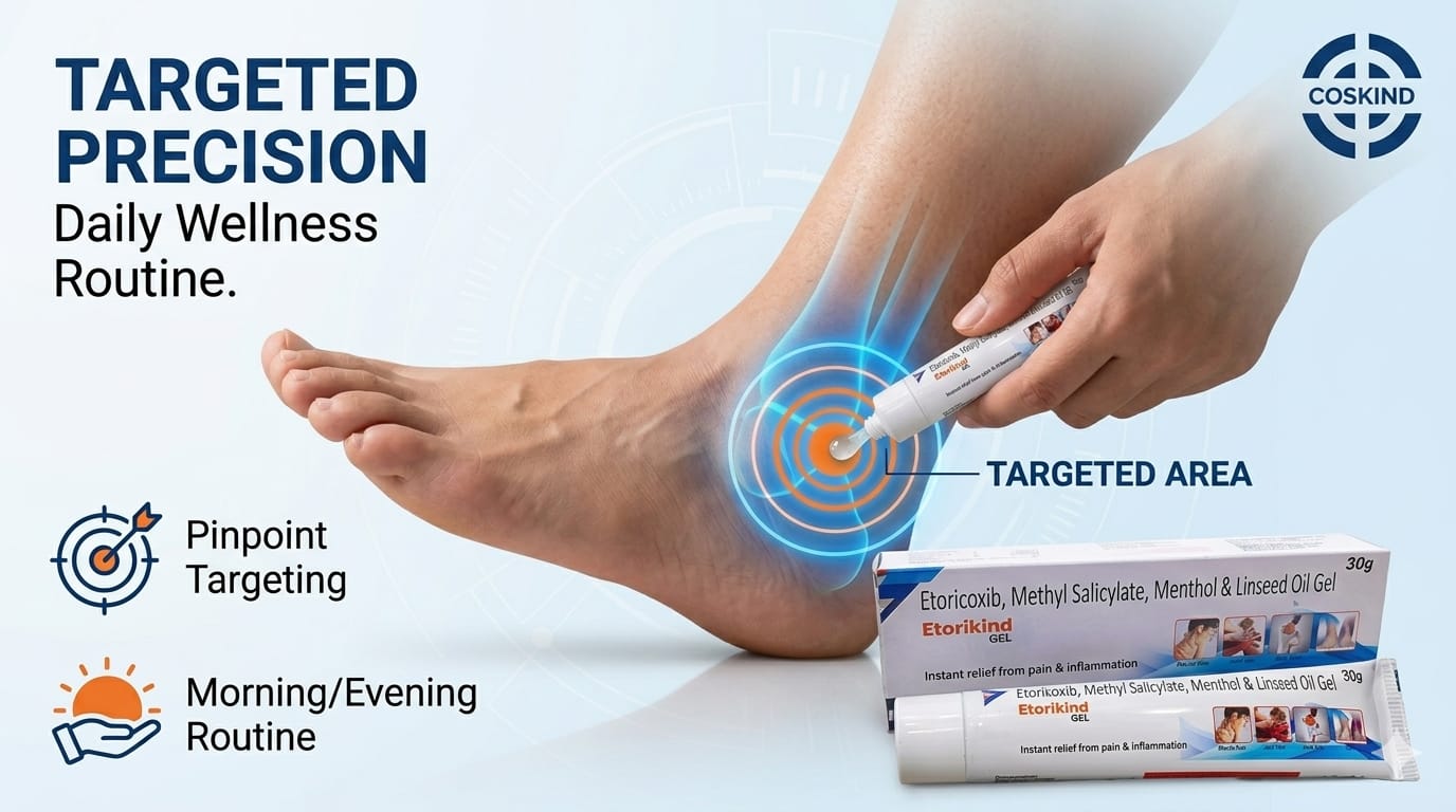 Information about EtoriKIND GELEtoricoxib UsesEtoricoxib is used for pain relief. It relieves pain and inflammation in conditions like rheumatoid arthritis, ankylosing spondylitis, and osteoarthritis.How Etoricoxib worksEtoricoxib is a non-steroidal anti-inflammatory drug (NSAID) called COX-2 inhibitors. It works by blocking the release of certain chemical messengers that are responsible for pain and inflammation (redness and swelling)