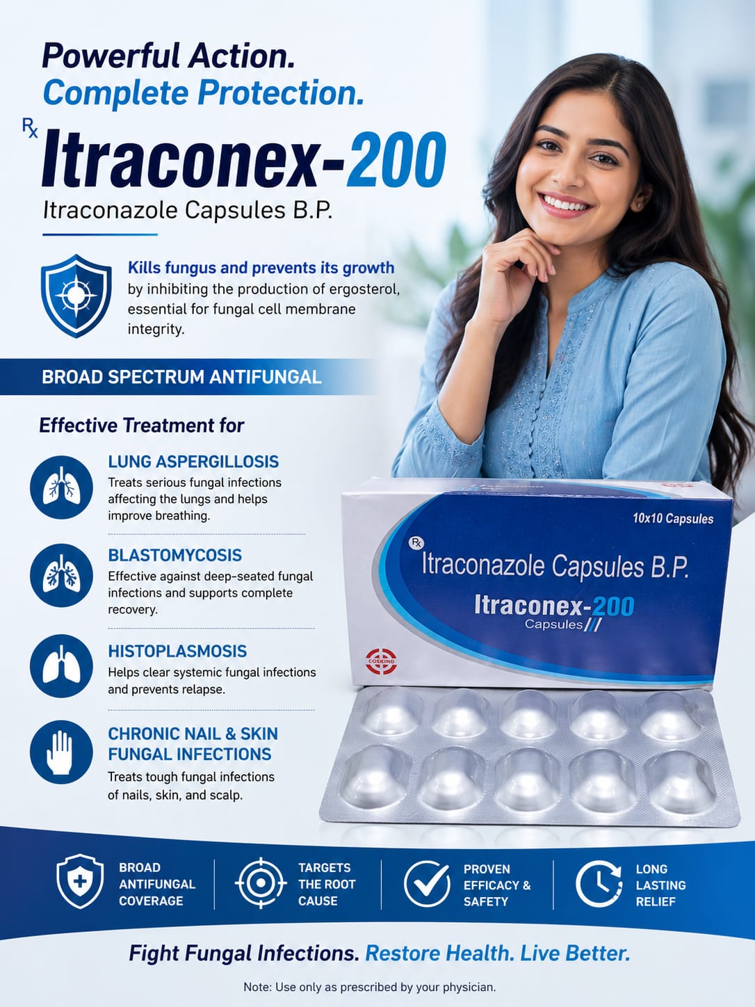 Product introductionItra 200mg Capsule belongs to a group of medicines called antifungals. It works by stopping the growth of fungi and is used to treat infections of the mouth, throat, vagina, and other parts of the body including fingernails and toenails. It kills fungi by destroying the fungal cell membrane.