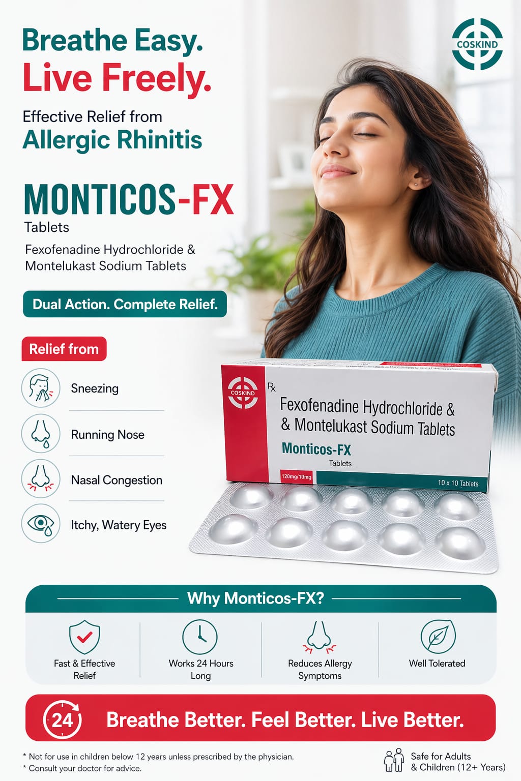 Montelukast + FexofenadineINFORMATION ABOUT MONTELUKAST + FEXOFENADINEMontelukast + Fexofenadine UsesMontelukast+Fexofenadine is used in the treatment of sneezing and runny nose due to allergies.How Montelukast + Fexofenadine worksMontelukast is a leukotriene antagonist. It works by blocking the action of a chemical messenger called leukotriene. This reduces inflammation (swelling) in the airways and nose and improves symptoms. Fexofenadine is an antiallergic which blocks the action of another chemical messenger (histamine) responsible for runny nose, watery eyes and sneezing.